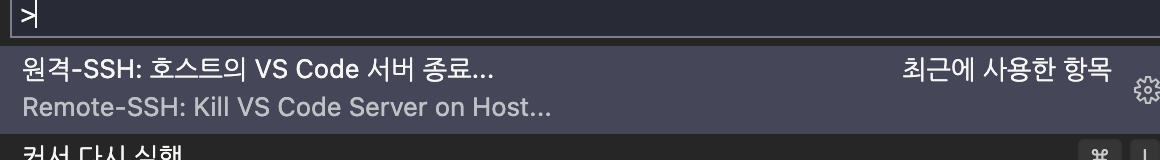 cmd+p 에서 다음과 같이 호스트의 vs code 서버 종료에 들어가 원하는 서버의 호스트를 클릭해주면 된다.